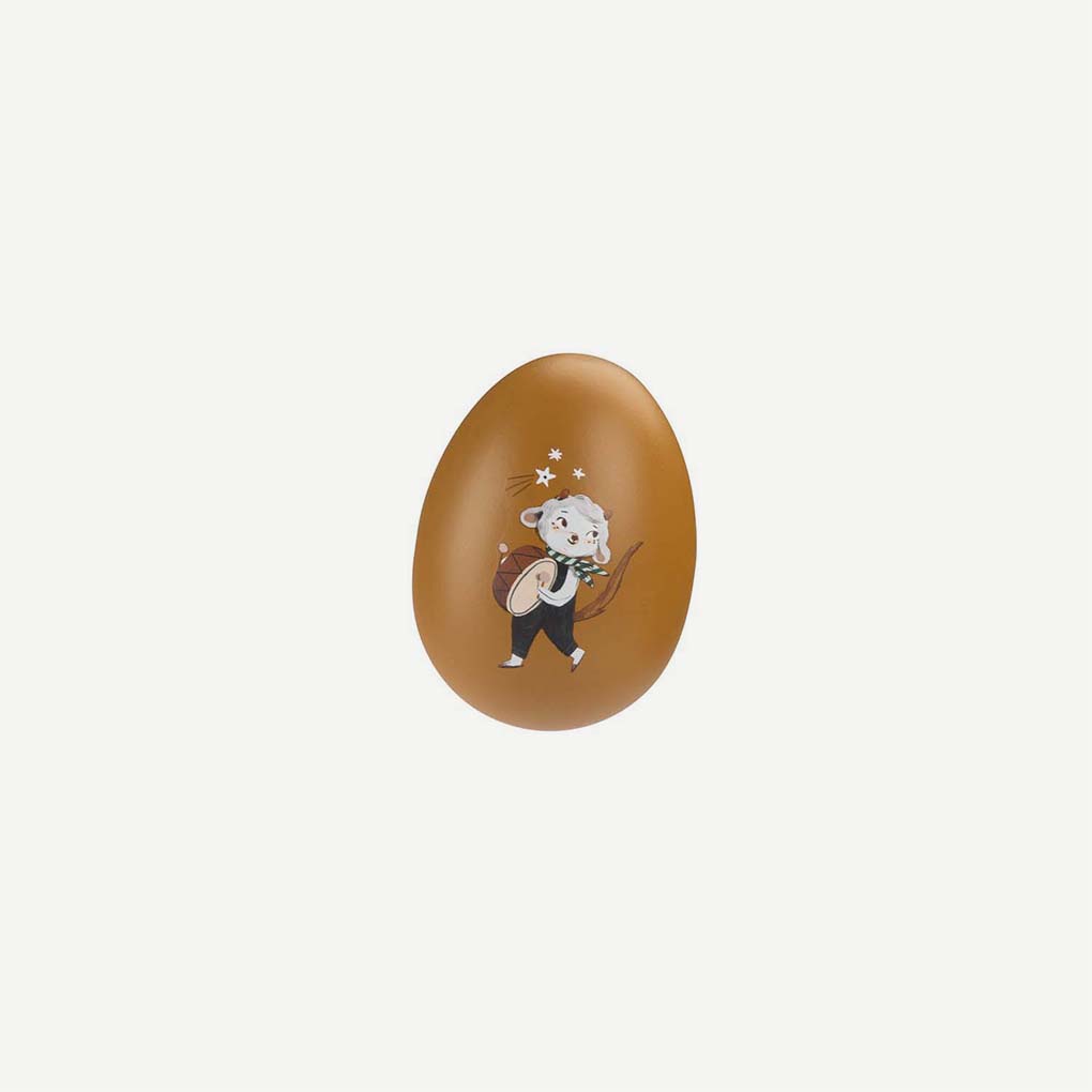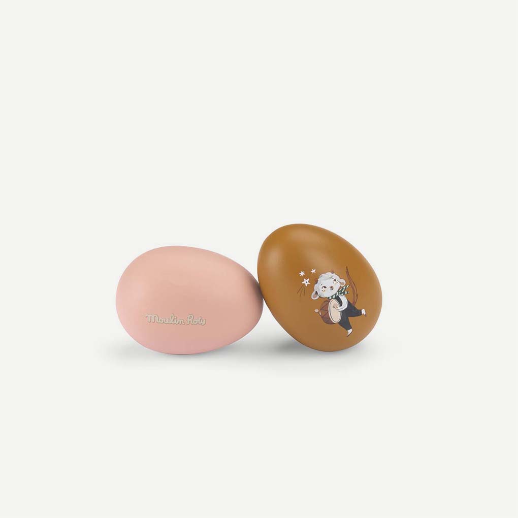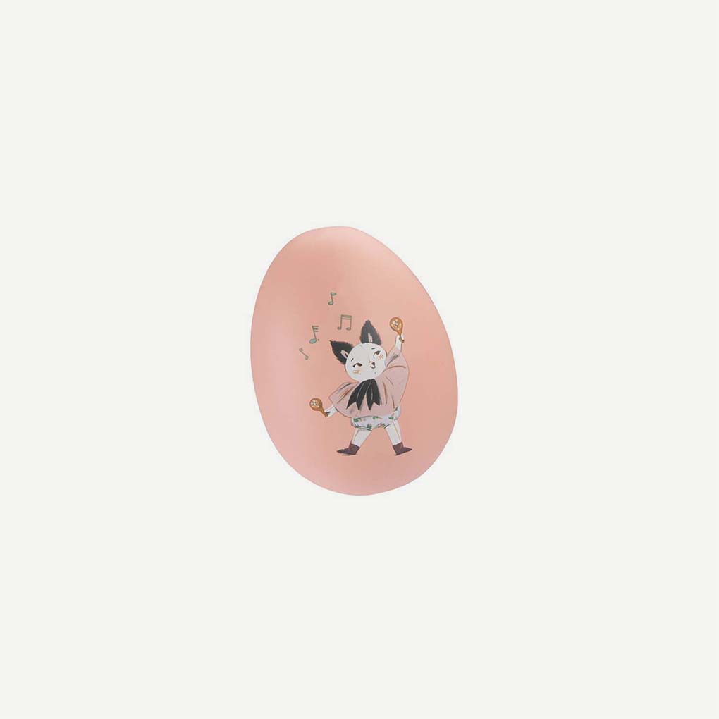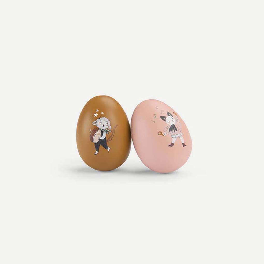 Pink and taupe painted wooden maraca eggs, decorated with poetic illustrations from the “After the Rain” collection, designed by Lucille Michieli. Sized to fit small hands, this toy develops rhythm and musical awareness in toddlers.