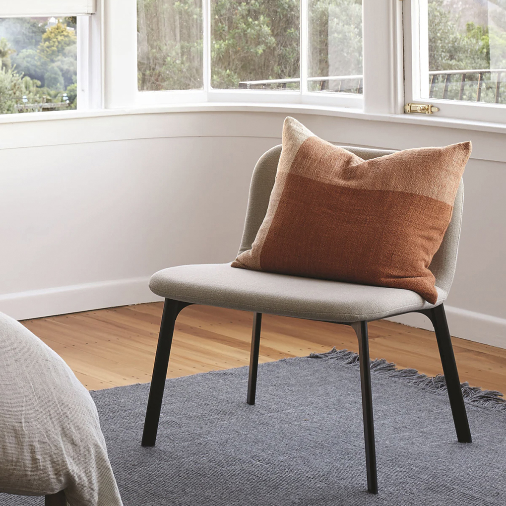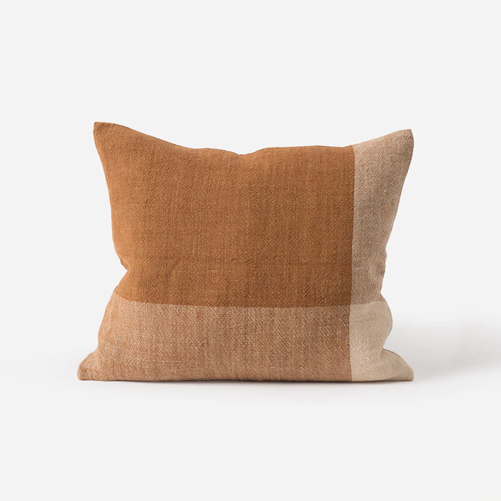 This handwoven Chester Linen Cushion has an organic, textured finish with a simple two-tone design in warm chestnut and macaroon hues.