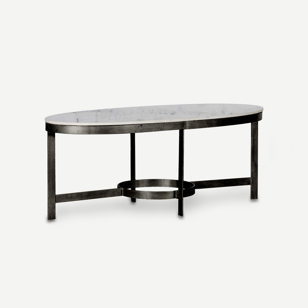 The elegant proportions of the oval Kazumi coffee table with black iron legs are finished with a beautiful white marble top.