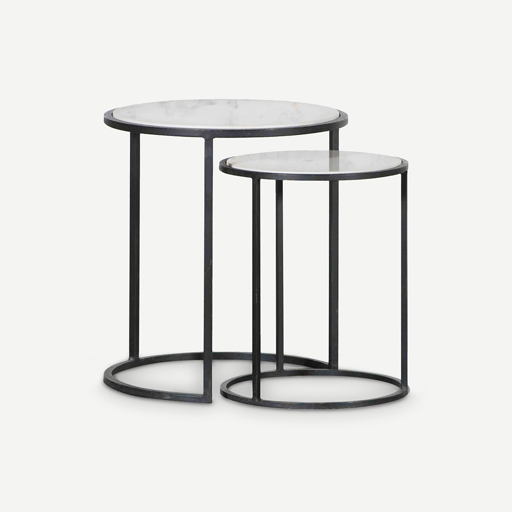 The Ellis nesting side tables feature a stylish mix of sleek white marble with black iron base.
