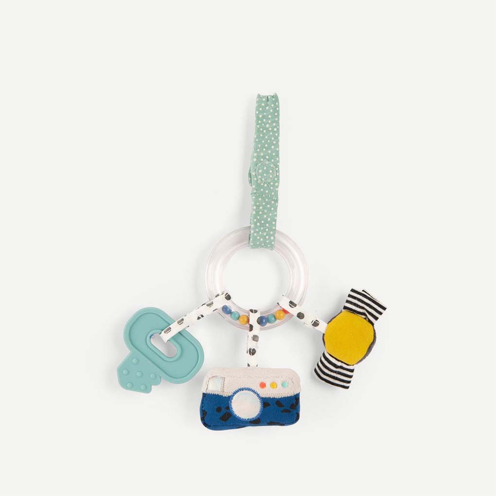An activity ring to manipulate or hang. It consists of several amulets with different textures and sounds, and a large textured teething ring for little ones to chew on.