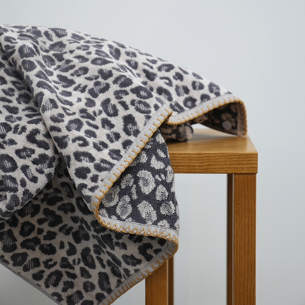 Animal print towel with blanket stitch detail in taupe. This multi-use quality towel is the perfect addition to your bathroom or your summer beach bag.