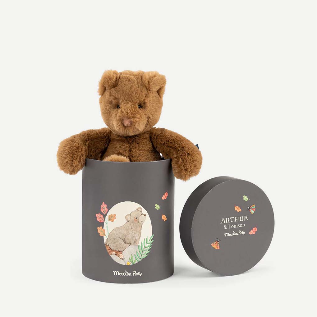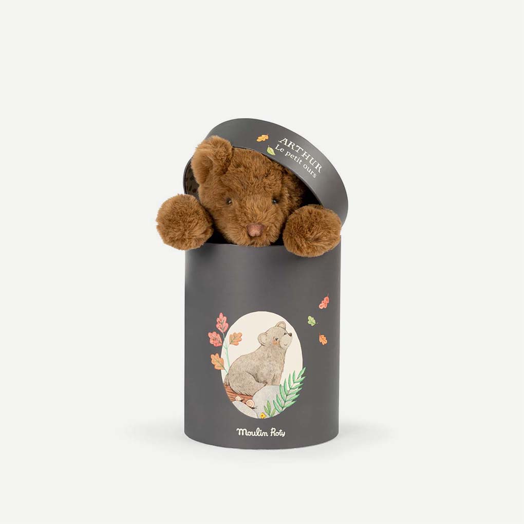 What a sweet little bear! Thanks to his soft fur, he’s the perfect companion for soothing and cuddling! Arthur Bear waits patiently in a beautifully illustrated round box.