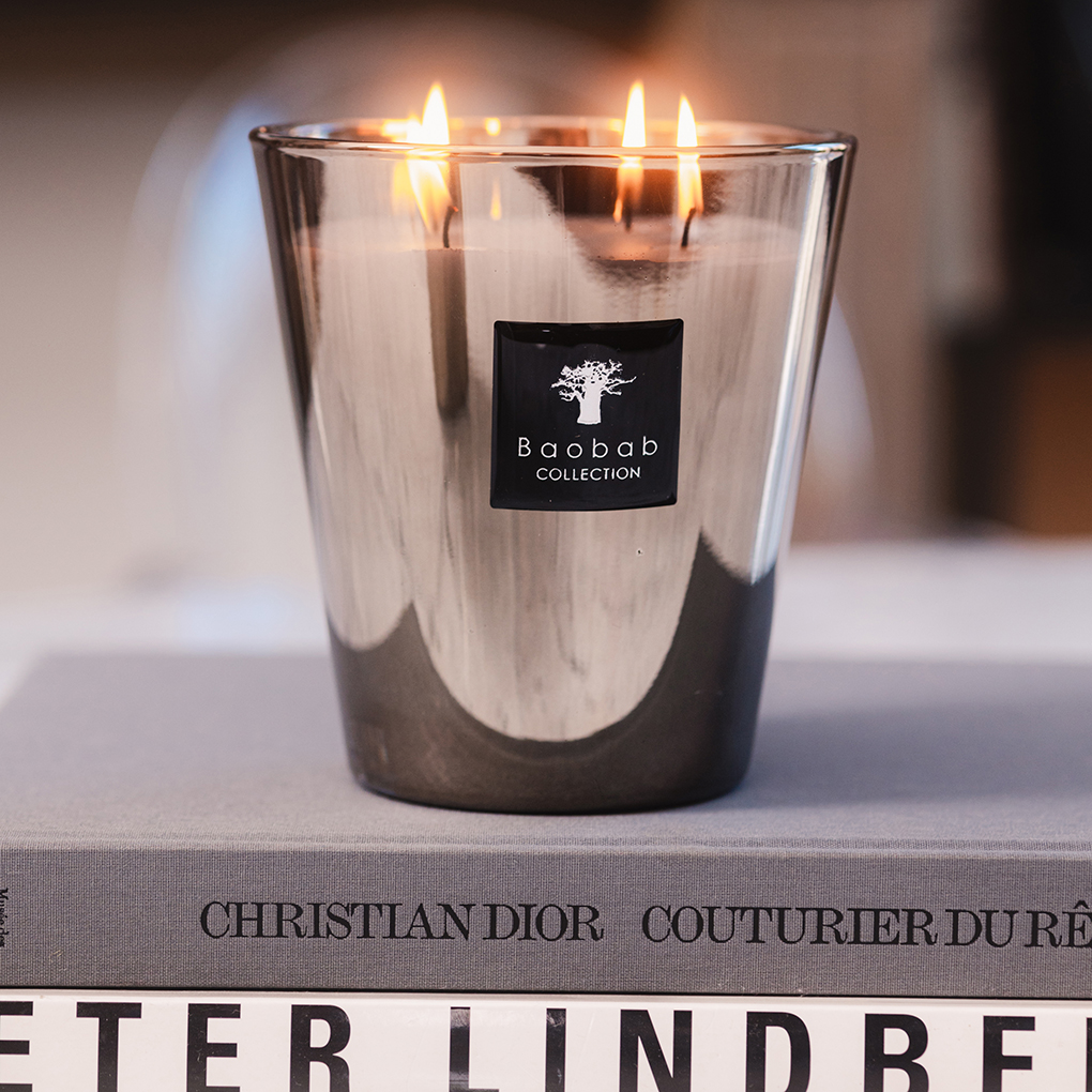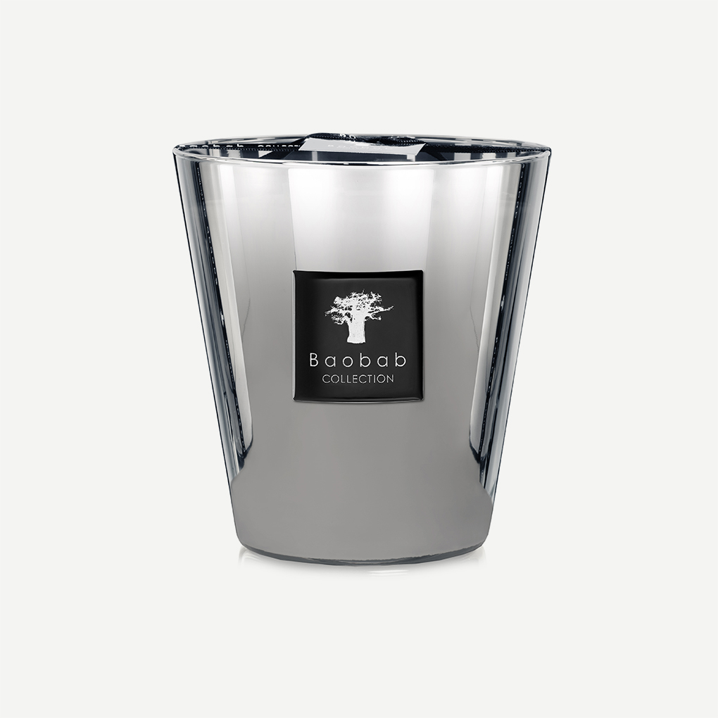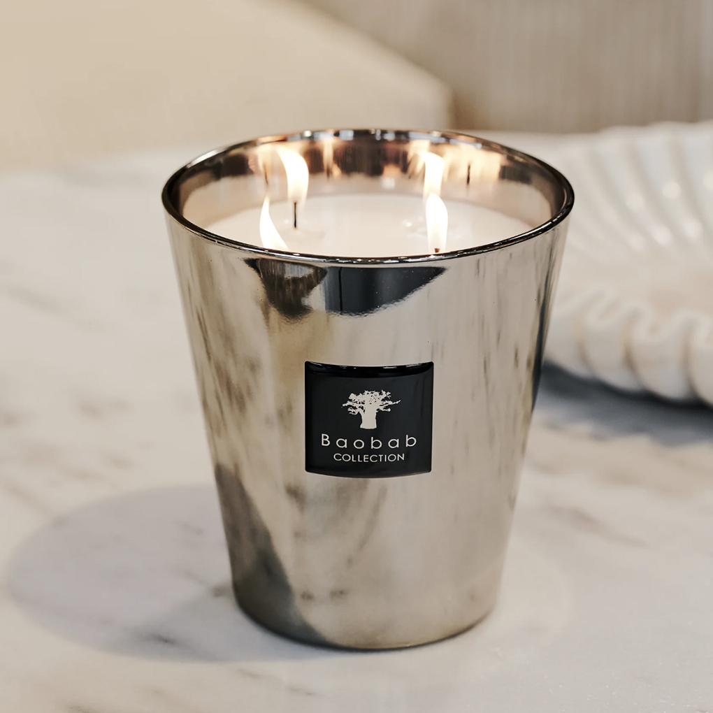 This Baobab Platinum scented candle is presented in a platinum plated casing. The aroma is full of fresh grapefruit, fused with scents of amber in hand poured white wax, which offer a warm and relaxing fragrance.