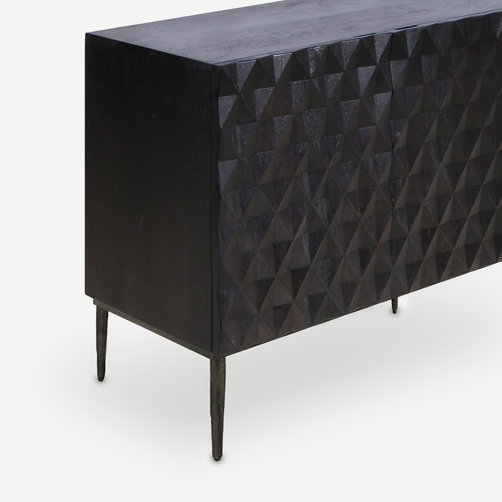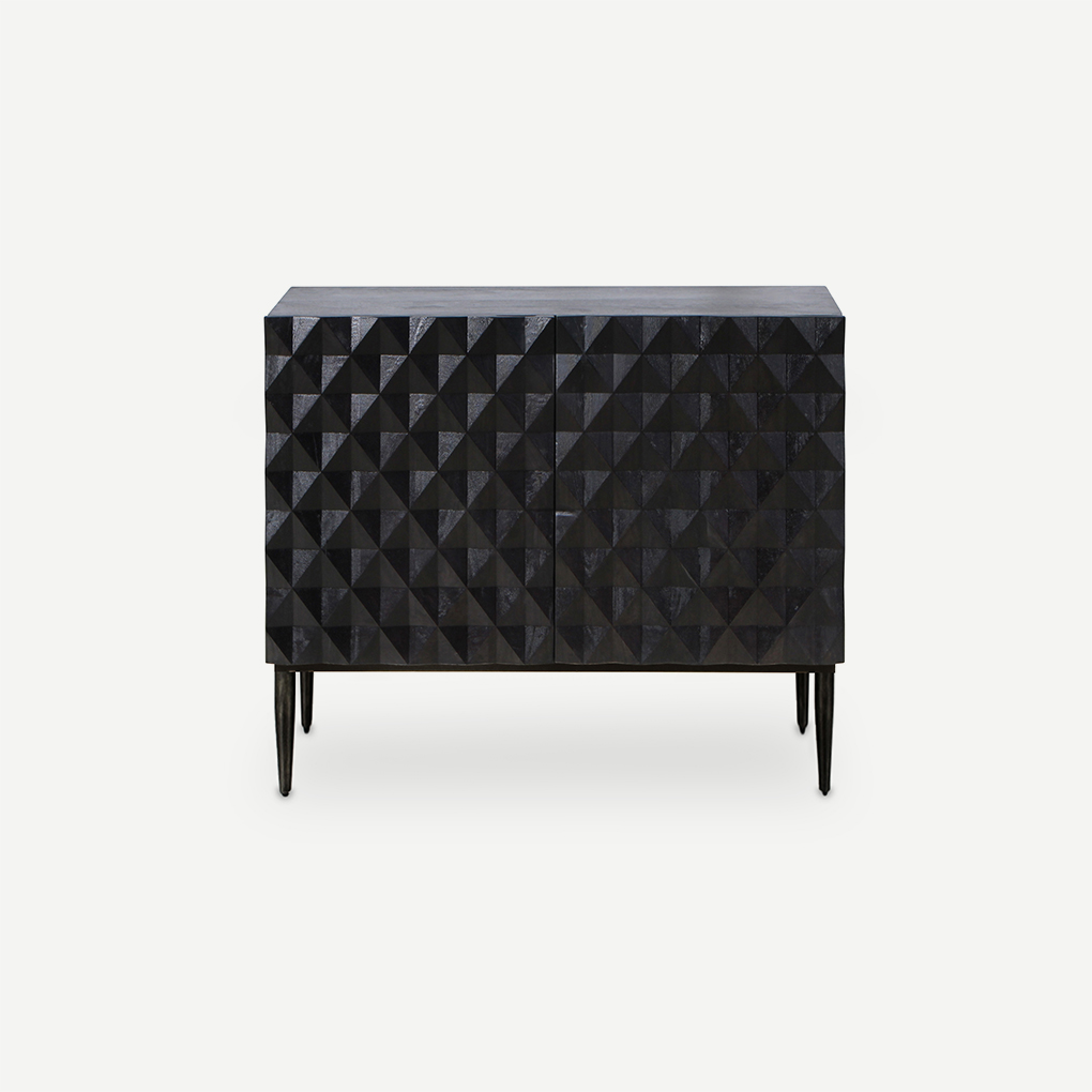 Add contemporary texture with the dark geometric patterns of the two door Basque cabinet in blackwash with black legs.