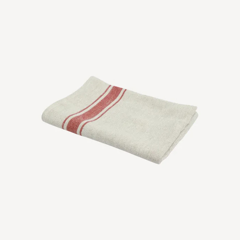 Absorbent 100% linen classic stripe design tea towel in natural and red. Fabric will soften and become more absorbent after each wash.