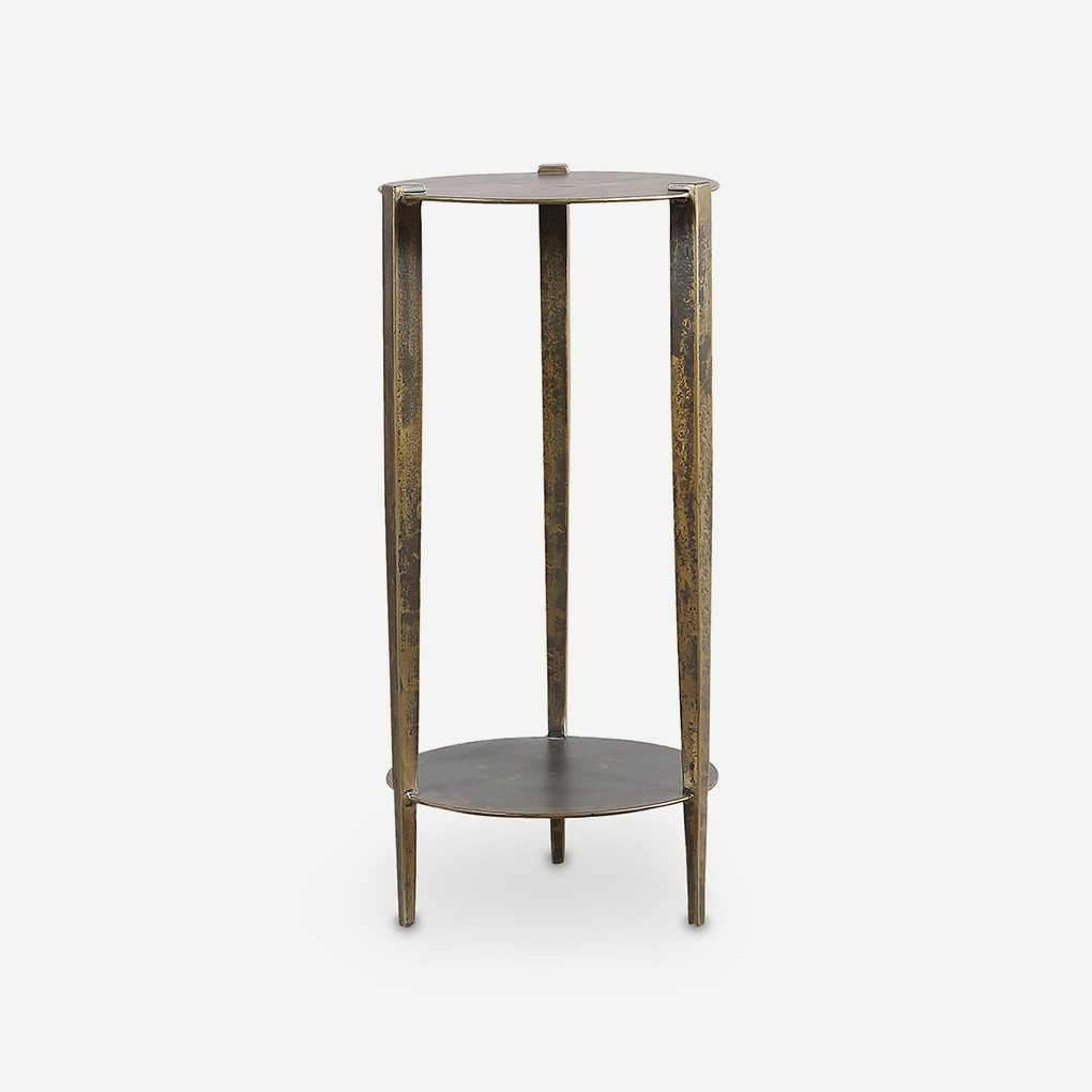 Slim and elegantly proportioned, the Farah side table features an antique brass finish, with top and bottom shelving.