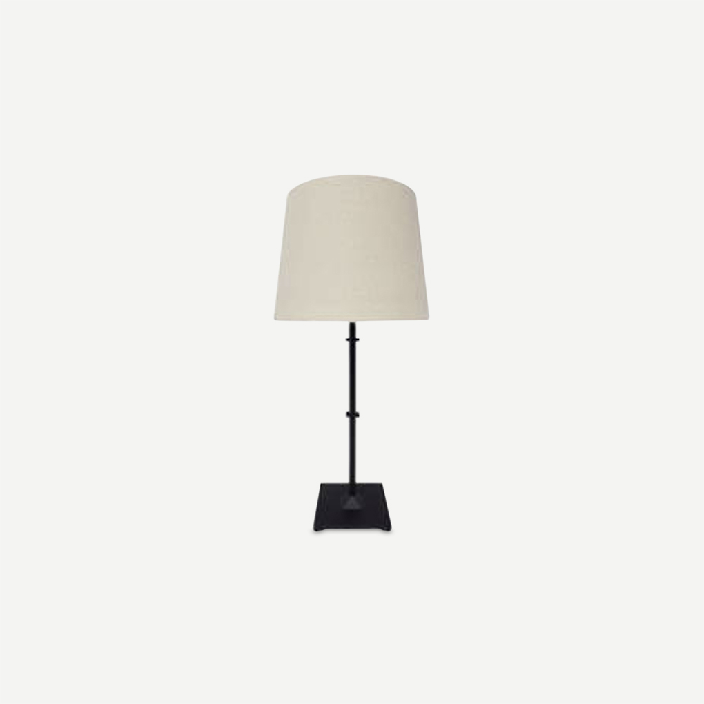 Black iron base with oatmeal lampshade.
