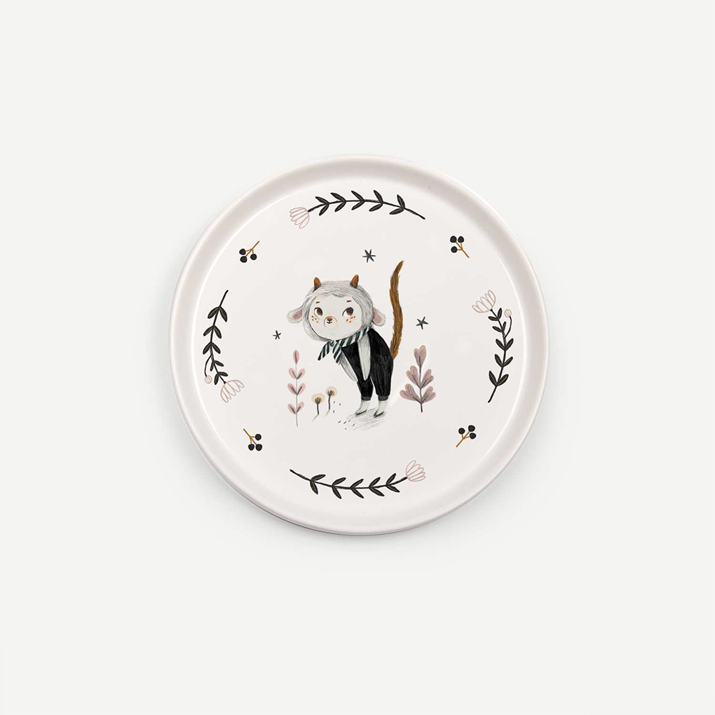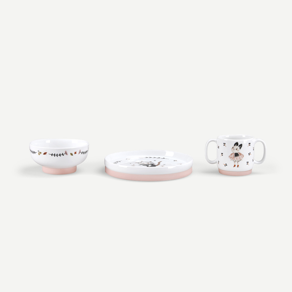 A beautifully illustrated porcelain dinnerware set for children to eat like grown-ups. Includes a bowl, a cup with handles, and a plate with a removable silicone non-slip base that grips smooth surfaces and prevents slipping! Dishwasher safe.