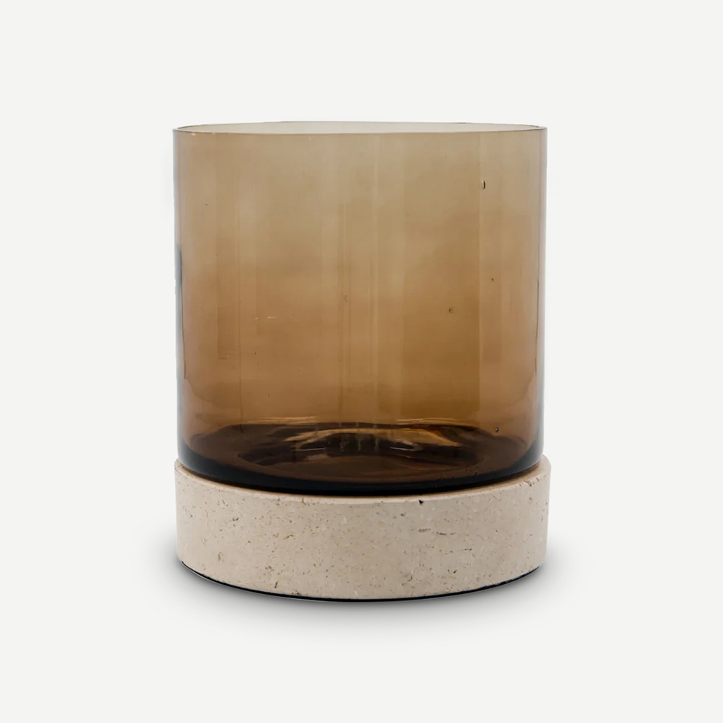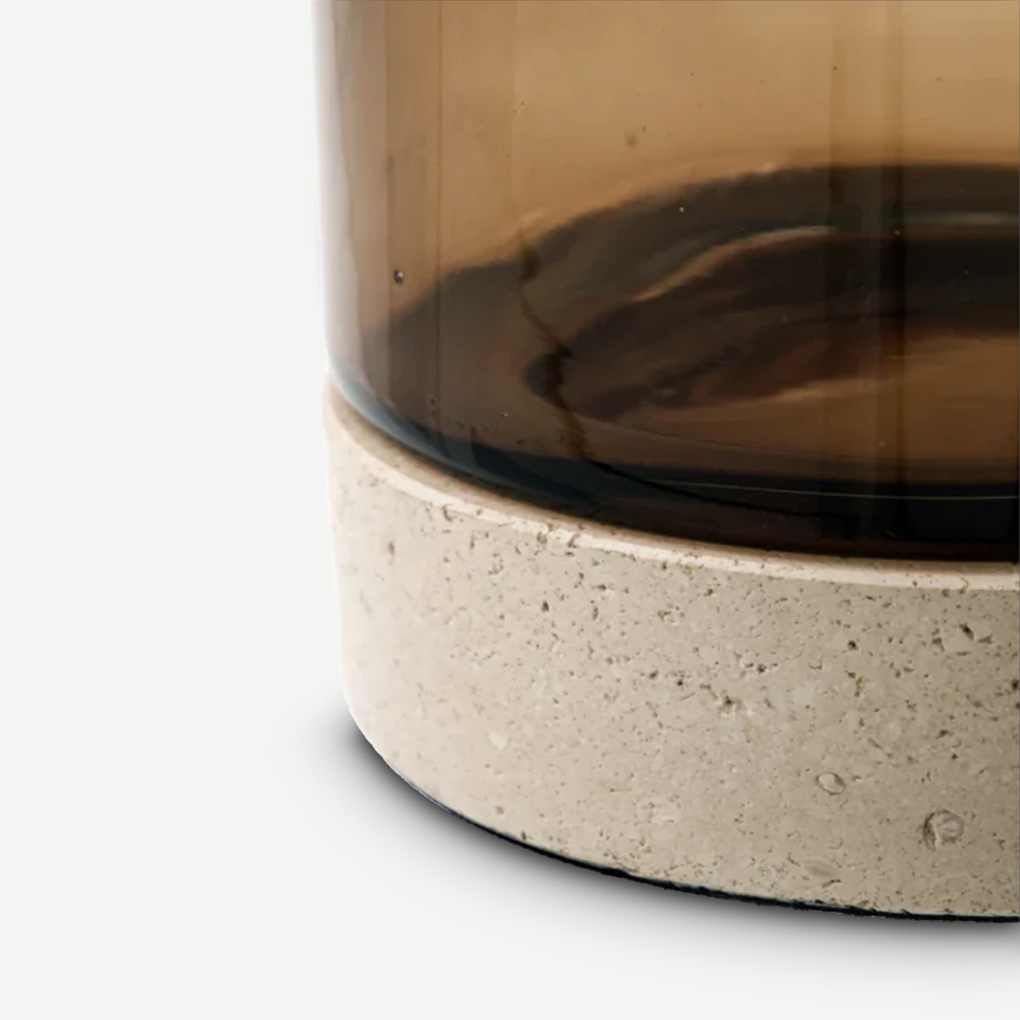 This elegant candle holder combines travertine and mouth-blown glass, adding a sophisticated touch to any room. The warm brown color and handmade finish result in something unique. The candle holder stands beautifully alone or together with others from the same series.