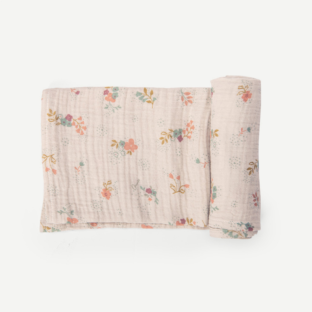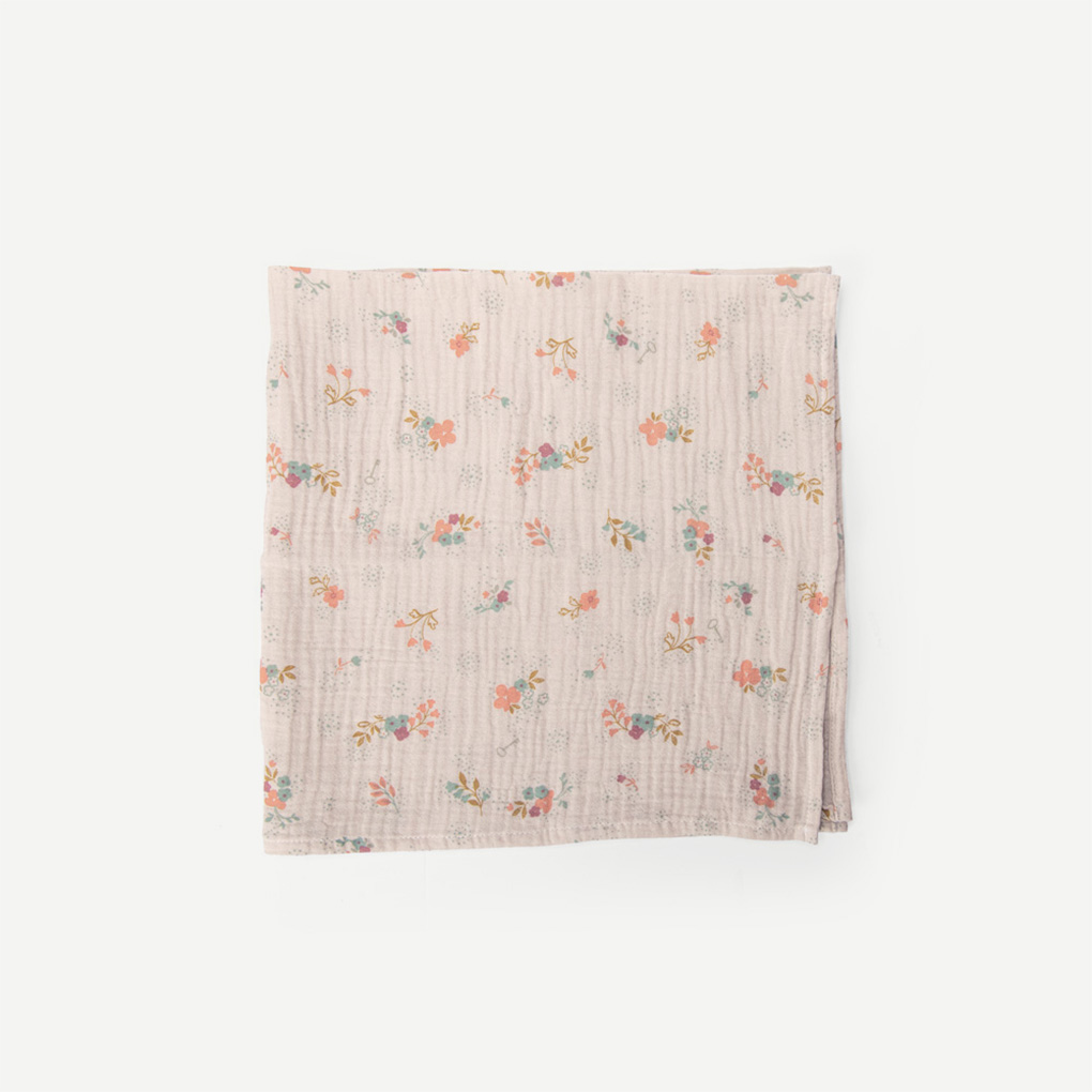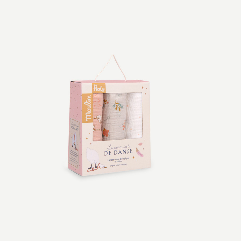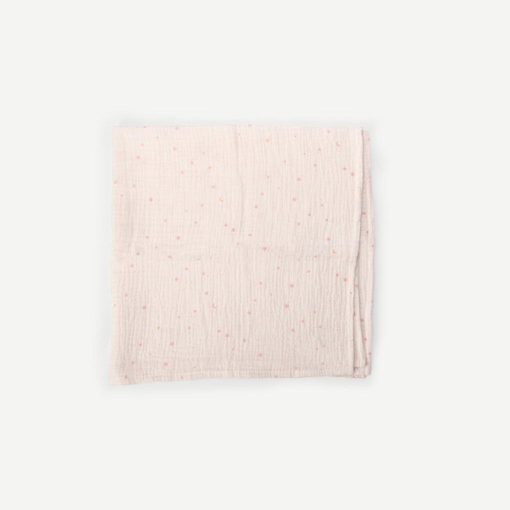Set of 3 printed muslin squares (pink/star/floral) certified OEKO-TEX® STANDARD 100 – CQ1337/1 IFTH, made of organic cotton. Absorbent and breathable fabric ideal for daily baby care (bib/cloth/changing mat).