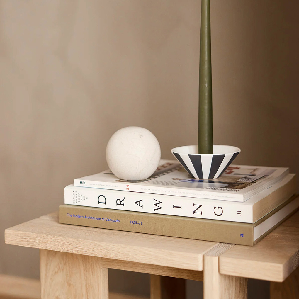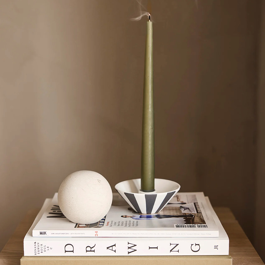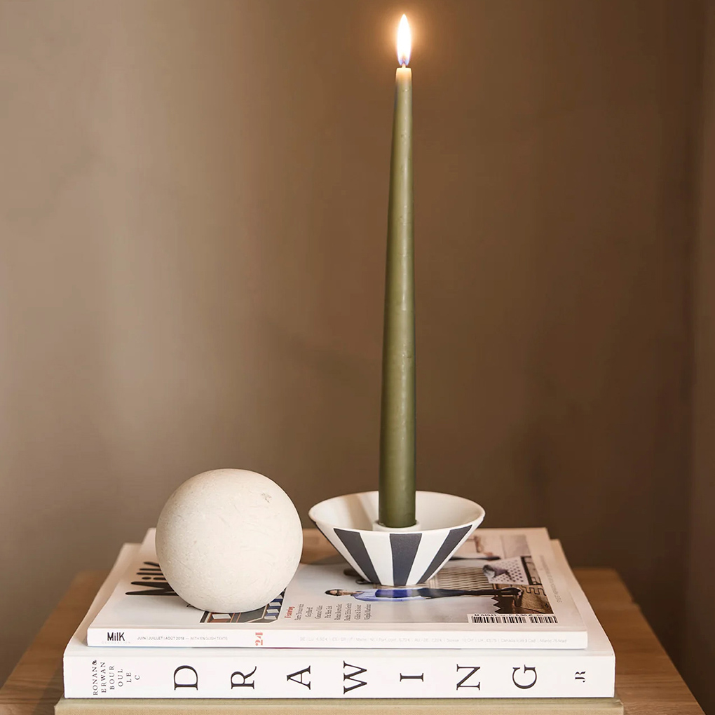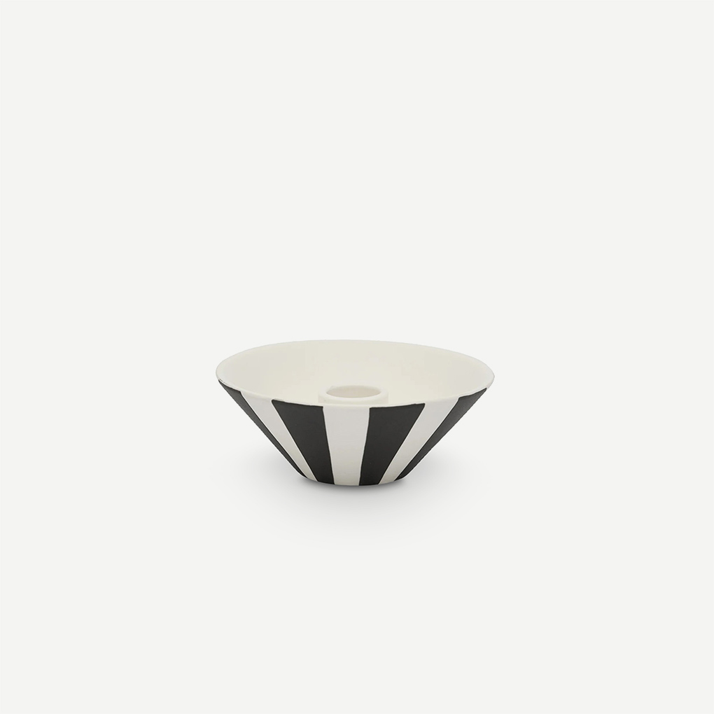 The Toppu Candleholder (low) is part of the Toppu Series, featuring a hand-painted striped design. It is designed to hold candles and adds a modern touch to your space. Each piece is hand-painted, making it unique.