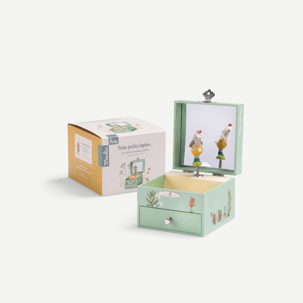 Musical box from the Three Little Rabbits collection. Open the box and watch the rabbit and his friend, the butterfly, delicately perched on the tip of his nose, twirl to a gentle melody. A small drawer provides storage for his precious secret.